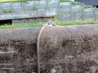 We did shove off at about 11:00 a.m. We went through Lock 14(8 feet, rope and pipe) almost immediately (It's the one we took the picture of from the bridge.). After that was Lock 15(8 feet, rope). We've got the 8-foot locks down pat. Grab the ropes and hold on.